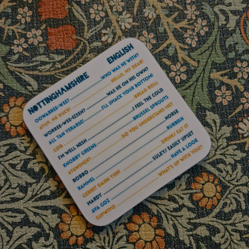 90x90mm hardboard coasters, with a printed gloss wipe-clean surface. Newark has its own very specific dialect, in amongst the usual Nottinghamshire...