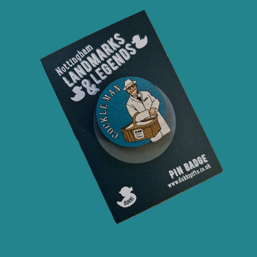 The living Legend Dave the Cockle Man, celebrated as a wooden pin. 38mm diameter. UV printed wooden lapel pin.