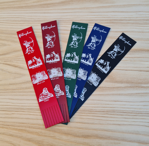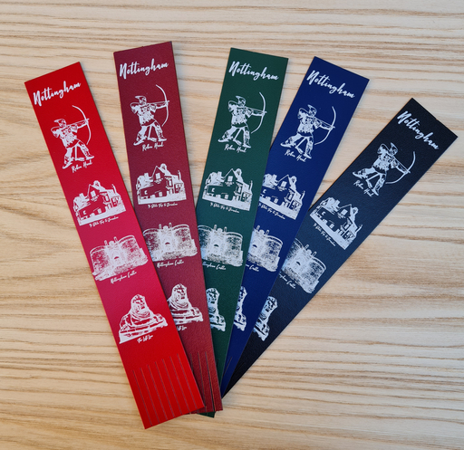 Leather bookmarks, available in five colours. Printed with four of Nottingham's city centre landmarks