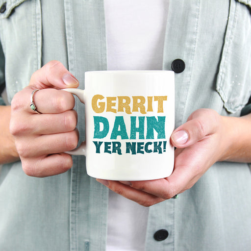Gerrit dahn yer neck! 10oz printed ceramic mugs. Dishwasher safe.