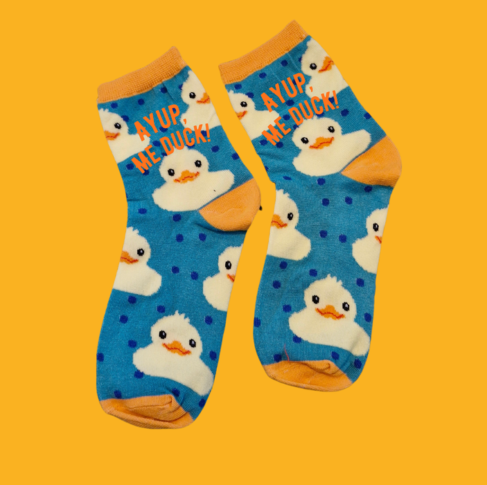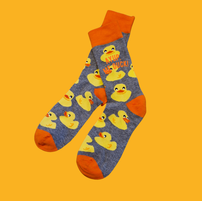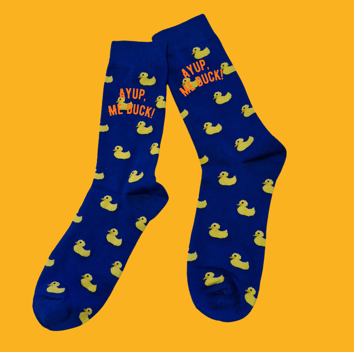 Individual pair of printed socks with rubber ducks on. Reads 'Ayup, me duck,' on each sock.