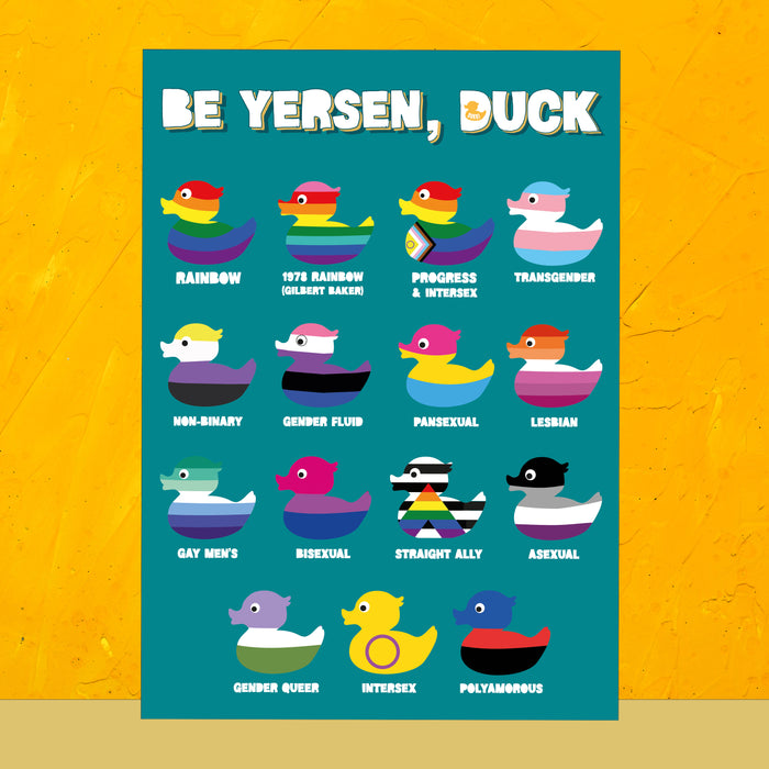 Quack up your pride with a Be Yersen Duck Pride flag print! This quirky print showcases your love for the LGBTQIA+ community and ducks. Spread love and quacks with this playful addition to your collection.