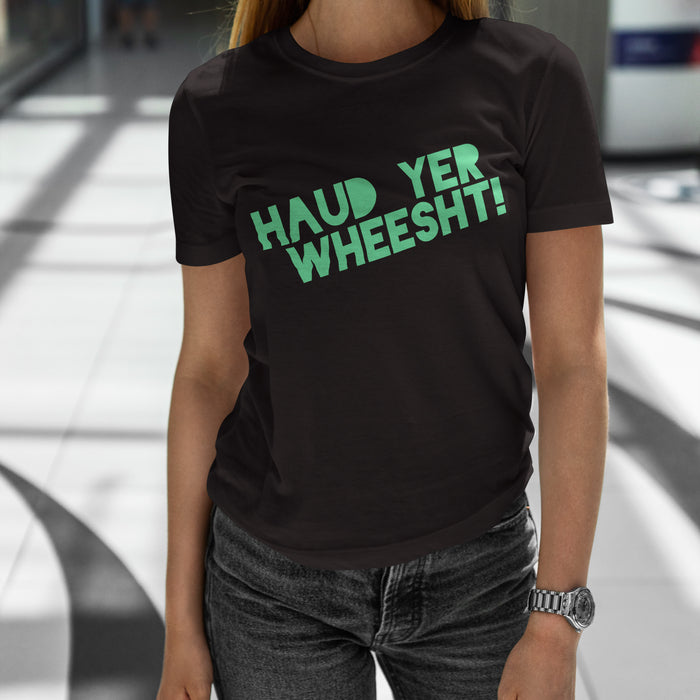 Heavy-weight 100% cotton T-shirt, in Black with mint-green print. Choose from a variety of other colours here.