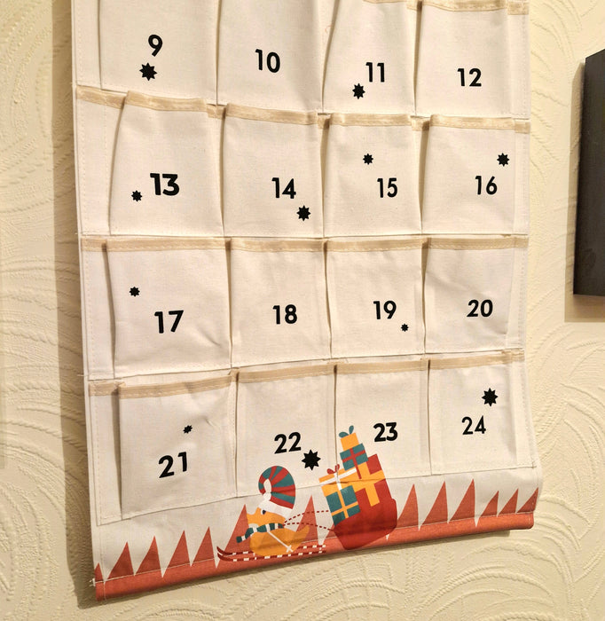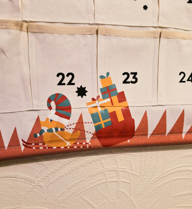 24 individual numbered pockets, each with a different treat inside. Available with red or black trim.